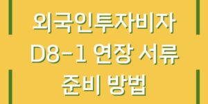 외국인투자비자 D8-1 비자는 한국에서 외국인이 직접 투자하여 사업을 운영할 수 있도록 허가하는 중요한 비자입니다. 이 비자를 소지하고 있는 외국인 투자자들은 투자 기간이 만료되기 전에 연장을 신청해야 하며, 연장 신청을 위해서는 …